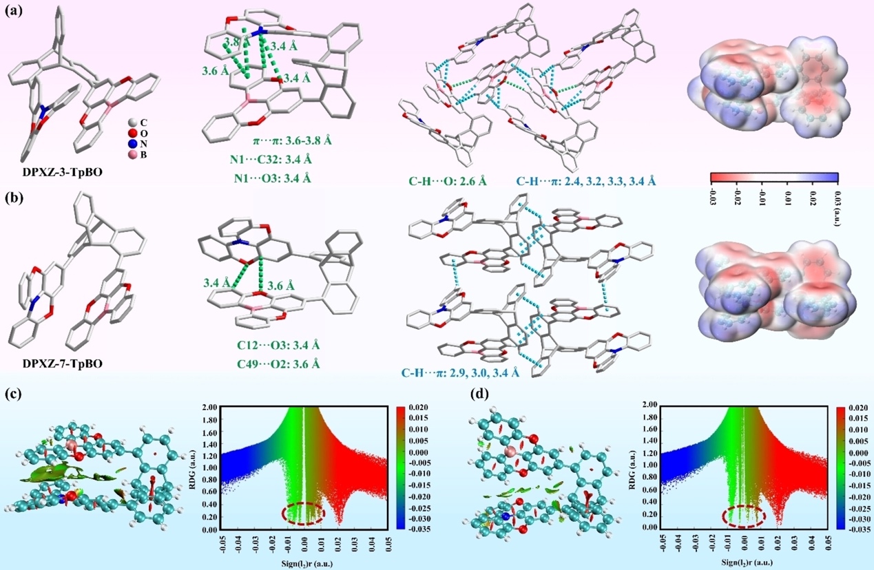 图1. DPXZ-3-TpBO(a)和DPXZ-7-TpBO(b)的单晶结构、分子内相互作用、分子间相互作用和静电势(ESP)表征;DPXZ-3-TpBO(c)和DPXZ-7-TpBO(d)单晶的约化密度梯度图
