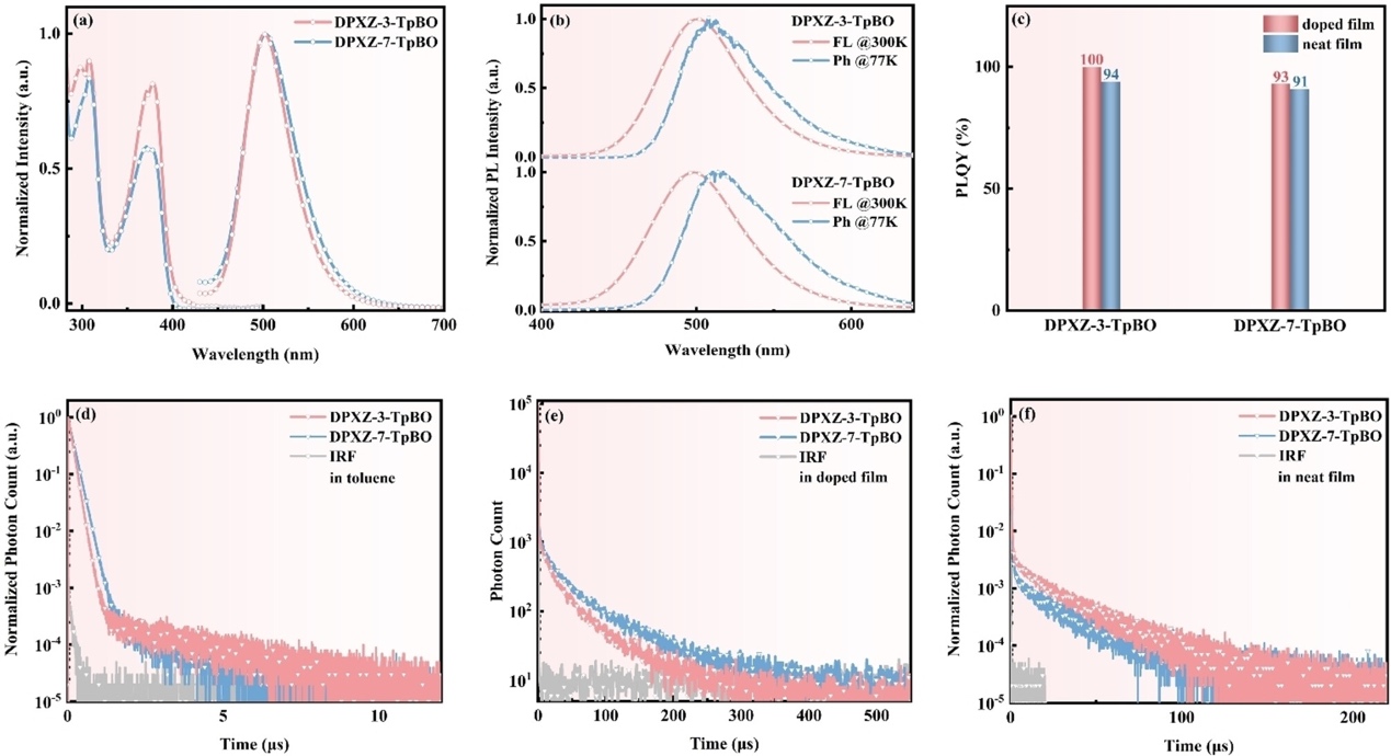 两种分子在不同极性溶剂中的PL光谱从正己烷到氯仿均表现出明显的正溶剂发色性,证实了典型的电荷转移特征。此外,DPXZ-3-TpBO和DPXZ-7-TpBO表现出典型的聚集诱导发射(AIE)特性。作者在充气和脱气条件下测量稀释甲苯溶液中的瞬态PL光谱结果证实了两种TSCT分子的发射性质。值得注意的是,DPXZ-3-TpBO在掺杂和纯膜中分别表现出100%和94%的极高PLQY,代表了TSCT-TADF发射体的最高值。DPXZ-7-TpBO在掺杂和纯膜中也显示出93%和91%的高PLQY(图4)。