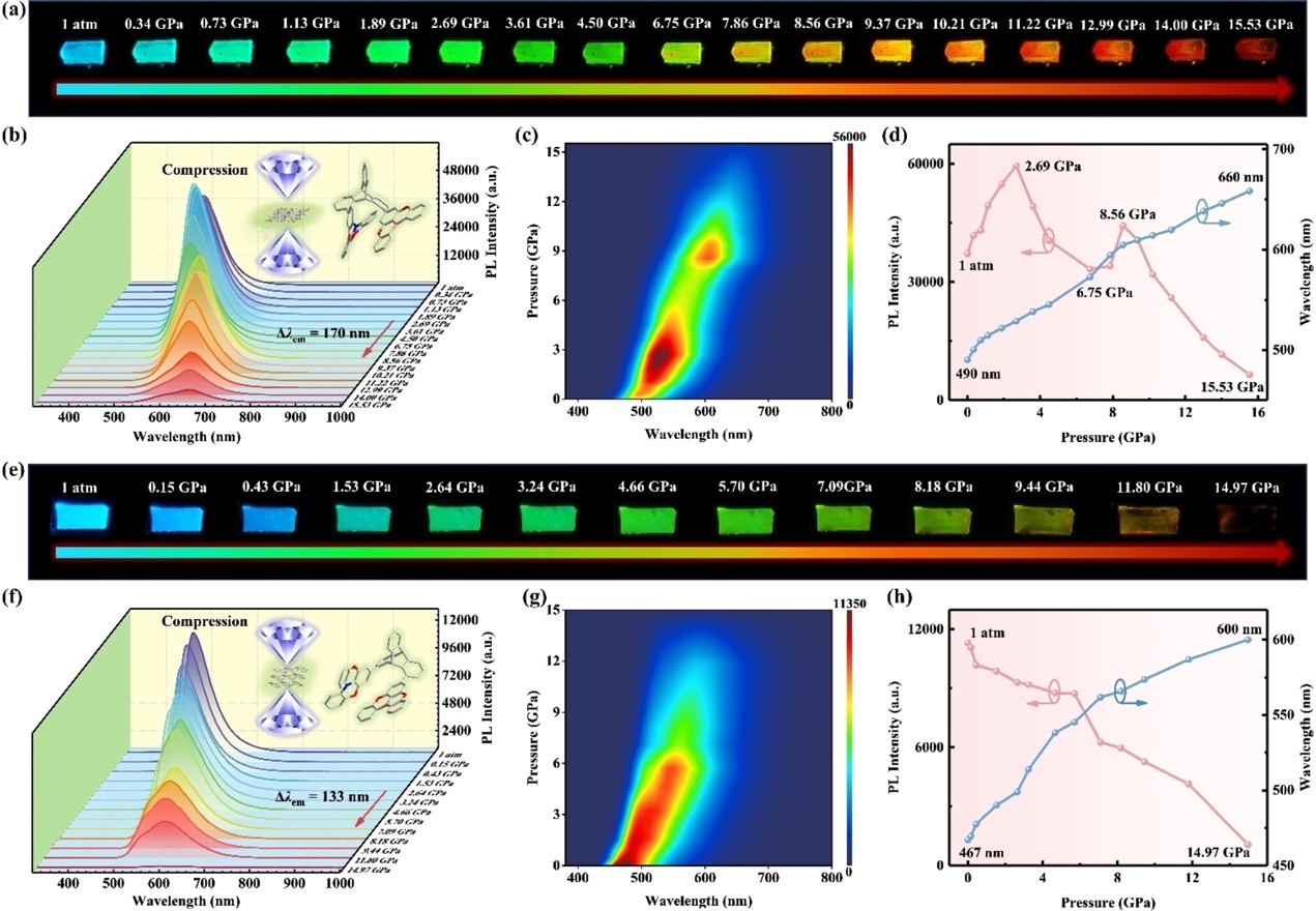 接着,作者研究了DPXZ-3-TpBO和DPXZ-7-TpBO晶体在不同压力下光致发光(PL)特性。结果表明,随着压力的增加,DPXZ-3-TpBO和DPXZ-7-TpBO晶体的PL光谱均发生全色红移,分别展现出170 nm和133 nm的压电变色效应(图2)。这种全色红移现象在单组分有机PCL材料中仍然很少见。