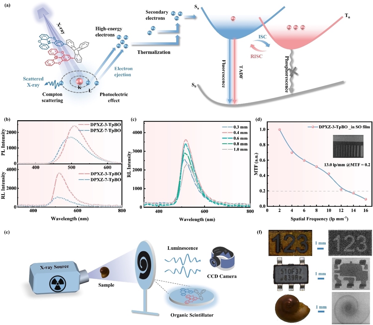 最后,基于TSCT分子大的Stokes位移和高效的TADF发光特性,作者将它们应用于X射线闪烁成像。测得DPXZ-3-TpBO和DPXZ-7-TpBO的光产额分别为12577和9227 photons MeV-1。DPXZ-3-TpBO的检测限为13.4 μGyair s-1。作者将DPXZ-3-TpBO均匀地嵌入到蔗糖八乙酸酯(SO)基质中,用于X射线闪烁体成像,实现了13.0 lp mm-1的成像分辨率(图5)。该闪烁体薄膜可以对多种目标物(如金属板、电子芯片和蜗牛)进行高质量X射线图像,证明了TSCT闪烁体的实际应用价值。