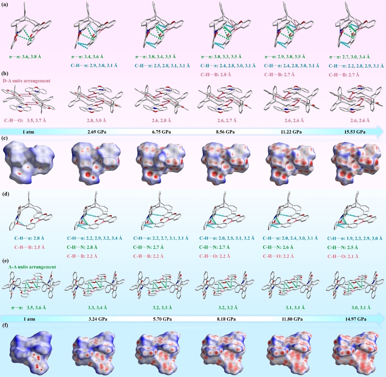 为了阐明各向同性流体静压力处理引起的TADF性质转变背后的机制,作者分析了两种晶体的分子非共价相互作用和三维Hirschfeld表面。对于DPXZ-3-TpBO晶体,在常压下只有分子内π···π相互作用存在于D-A对,而分子间D-A相互作用很弱,此时分子内TSCT效应主导发射属性。随着压力的增加,π···π作用距离和分子间TSCT效应均发生变化,从而导致了发光强度和波长的变化。然而,对于DPXZ-7-TpBO晶体,D和A段内的分子内π···π重叠明显较小,导致TSCT效应较弱。此外,相邻的DPXZ-7-TpBO分子采用D-D和A-A模式排列,难以产生分子间TSCT效应(图3)。因此,随着压力的增加,分子空间逐渐减小,分子间π···π相互作用逐渐增加,导致了荧光逐渐减弱。