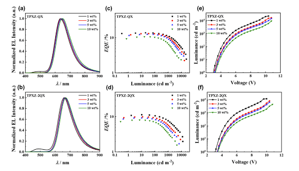 图4. 基于 TPXZ-QX 和 TPXZ-2QX 的器件性质。(a, b)器件的电致发光(EL)光谱。(c, d)器件的 EQE-亮度曲线。(e, f)器件的发光-电压曲线。