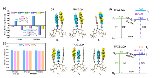 图3. (a)通过 I-SAPT 方法,TPXZ-QX 和 TPXZ-2QX 中选定片段之间的电子相互作用。(b) TPXZ-QX 和 TPXZ- 2QX 在 S0、S1 和 T1 极小点时 TPXZ 和 QX 片段质心之间的距。(c)空穴(蓝色)和电子(黄色)分布。(d) TPXZ-QX 和 TPXZ-2QX 可能的发光机制。S1 和 T1 态分别在其极小点结构分析,T2 态在 T1 极小点结构分析。