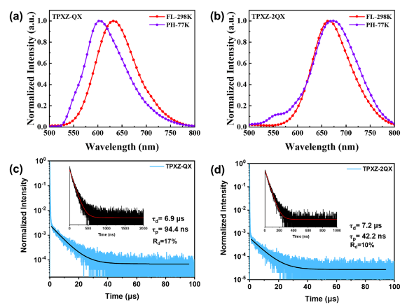 图2. TPXZ-QX 和 TPXZ-2QX 在掺杂 mCBP 薄膜(5wt %)中的(a, b)光致发光光谱和(c, d)瞬态光衰减曲线。Rd 表示延迟荧光组分的占比。