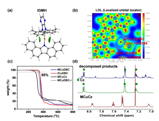 在本论文中,作者设计了一个名为13H-二苯并[a,i]咔唑(DBC)配体,具有独特的几何结构,除了与金属中心形成配位σ键外,还能够与金属中心形成一对金属-氢键相互作用,形成钳形螯合模式。MCuDBC和ICuDBC的单晶结构分析显示铜原子和HDBC原子之间的距离短至2.383A(图1)。理论计算也验证了Cu···H相互作用的存在,并揭示了其吸引力作用的属性。与参比化合物的对照实验证明了Cu···H相互作用对配合物分子稳定性具有显著提高的作用,其主要原因是有效抑制了Cu-N配位键的断裂(图2)。