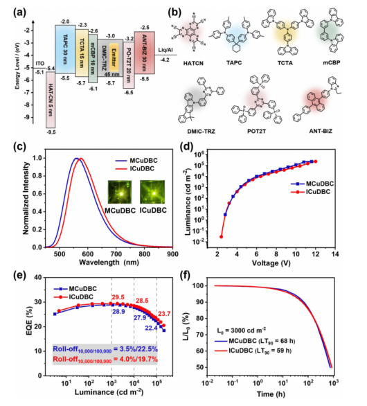如图3所示,采用两个含有金属-H键的铜配合物作为发光材料,真空蒸镀OLED的EQEmax值分别达到28.9%和29.5%,最大亮度超过230,000 cd m-2。在100,000 cd m-2的高亮度下,两个发射器件的效率滚降也只有约20%。在器件运行稳定性测试中,在初始亮度(L0)为3000 cd m-2测试条件下,MCuDBC的LT90为68小时。ICuDBC的LT90为59小时。据此估算,在L0为1000 cd m-2的情况下,MCuDBC和ICuDBC的LT90值分别为440小时和382小时,接近文献报道的黄光发射铜(I)类似物的405小时纪录。