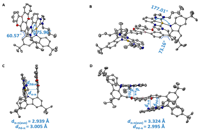 图2.(a)和(C)PdBO以及(B)和(D)DPdBO的晶体结构的透视图。上:卡宾配体和侧向受体相对于咔唑配体的扭转角。向下:PdBO和DPdBO中的分子内短p p和Pd p接触,显示C/N/Pd原子和受体平面之间的距离