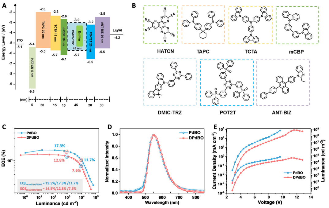 图5. (A)器件结构(B)装置中使用的功能材料的分子结构(C)具有1 wt%PdBO和DPdBO的器件的EQE对亮度的曲线图(D)1000 cd m-2下的归一化电致发光光谱(E)PdBO和DPdBO的电流密度和亮度对电压特性。