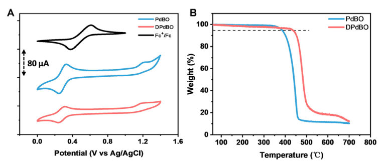 图3.(a)298 K下PdBO和DPdBO在DCM中的循环伏安图(CV)(B)PdBO和DPdBO在N2气氛下的热重分析(TGA)曲线