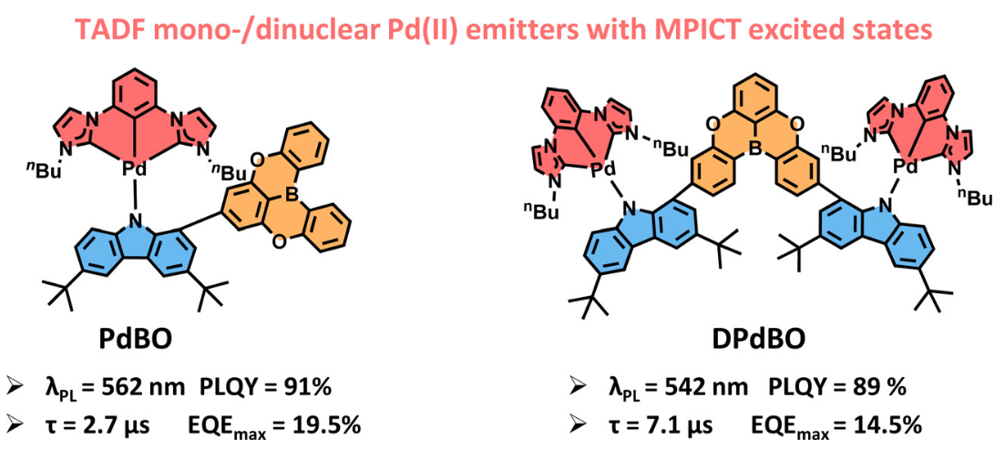 图1.MPICT型TADF单/双核Pd(II)发射体的化学结构以及关键的光物理和电致发光数据